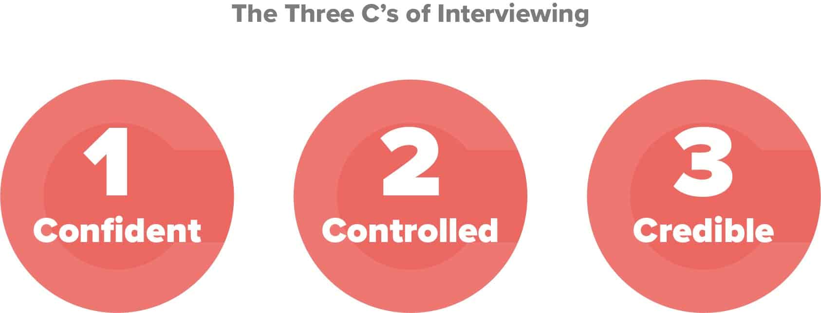 Graphic summarizing the three C’s of interviewing: 1) confident, 2) controlled, and 3) credible.