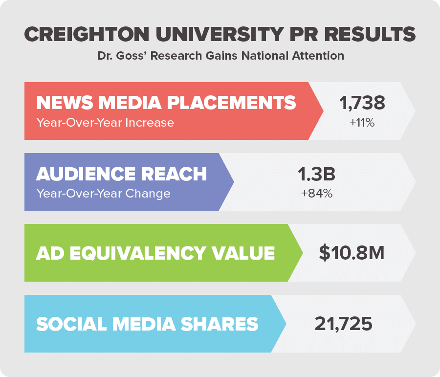 News media placements, audience reach, ad equivalency value, and social media shares results from Creighton University's Dr. Ernie Goss PR brand awareness campaign