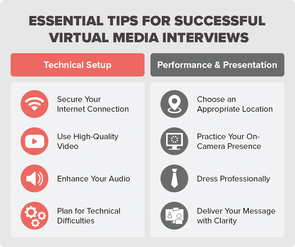 With more journalists relying on virtual media interviews via Zoom, Microsoft Teams, FaceTime and other video platforms, it’s critical for brand spokespeople and executives to follow media training best practices before and during virtual broadcast interviews. Here’s everything you need to do for online media interviews to represent your organization well and clearly communicate key messaging.