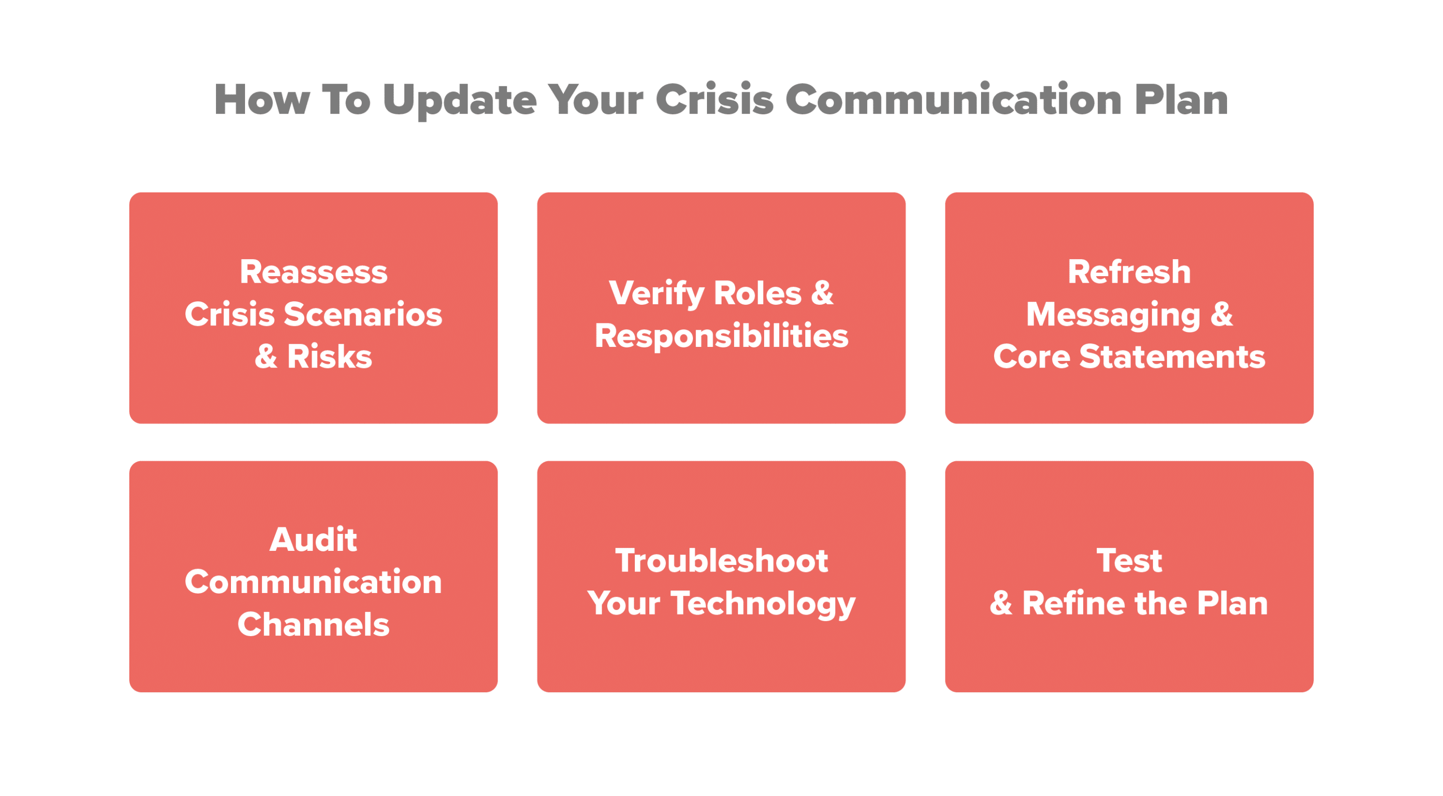 Six-step graphic on updating a crisis communication plan: reassess risks, verify roles, refresh messaging, audit channels, troubleshoot technology, and test the plan.