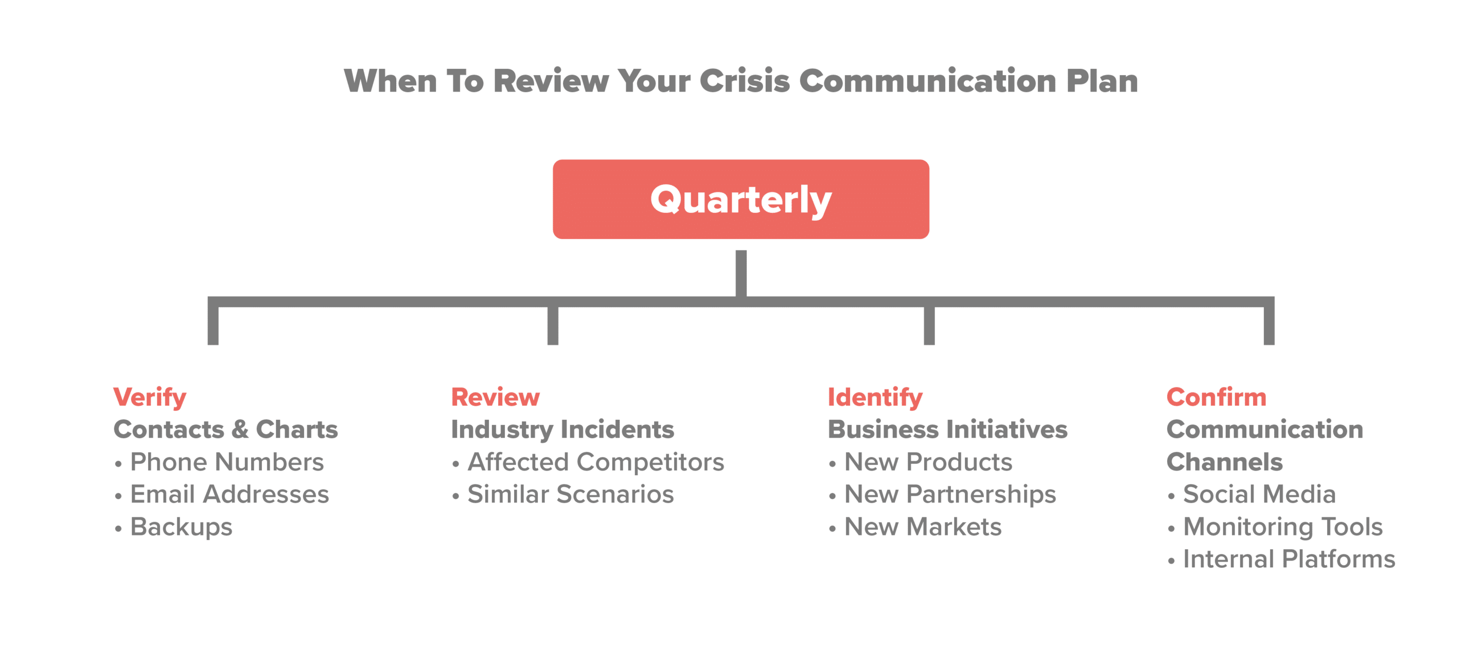 Quarterly crisis communication plan review, including verifying contacts, reviewing industry incidents, identifying new initiatives, and confirming communication channels.